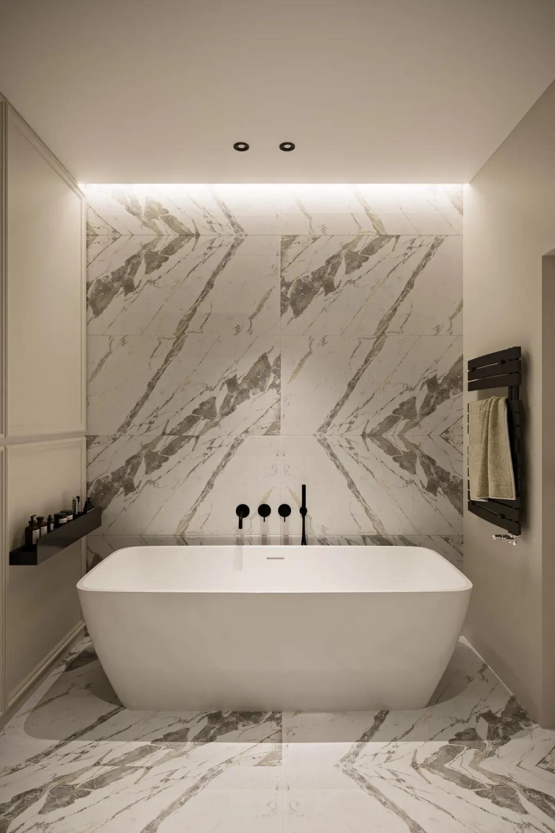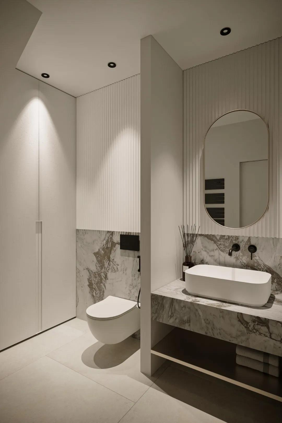 衛生間室內設計墻面分成了兩段,花紋大理石和白色的波紋磚,細膩柔和。