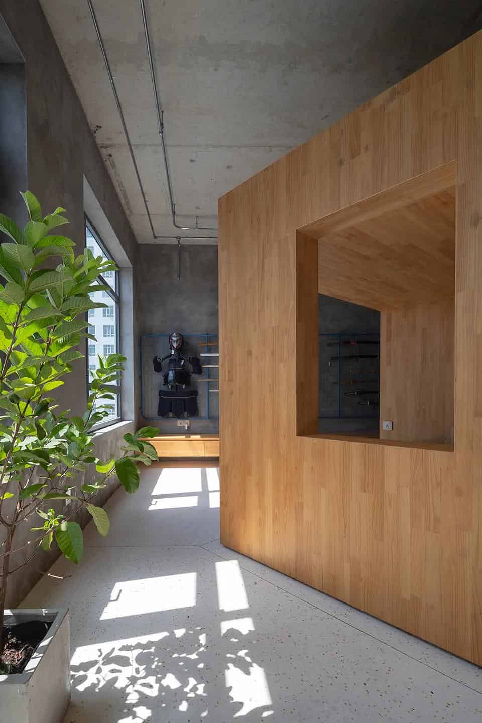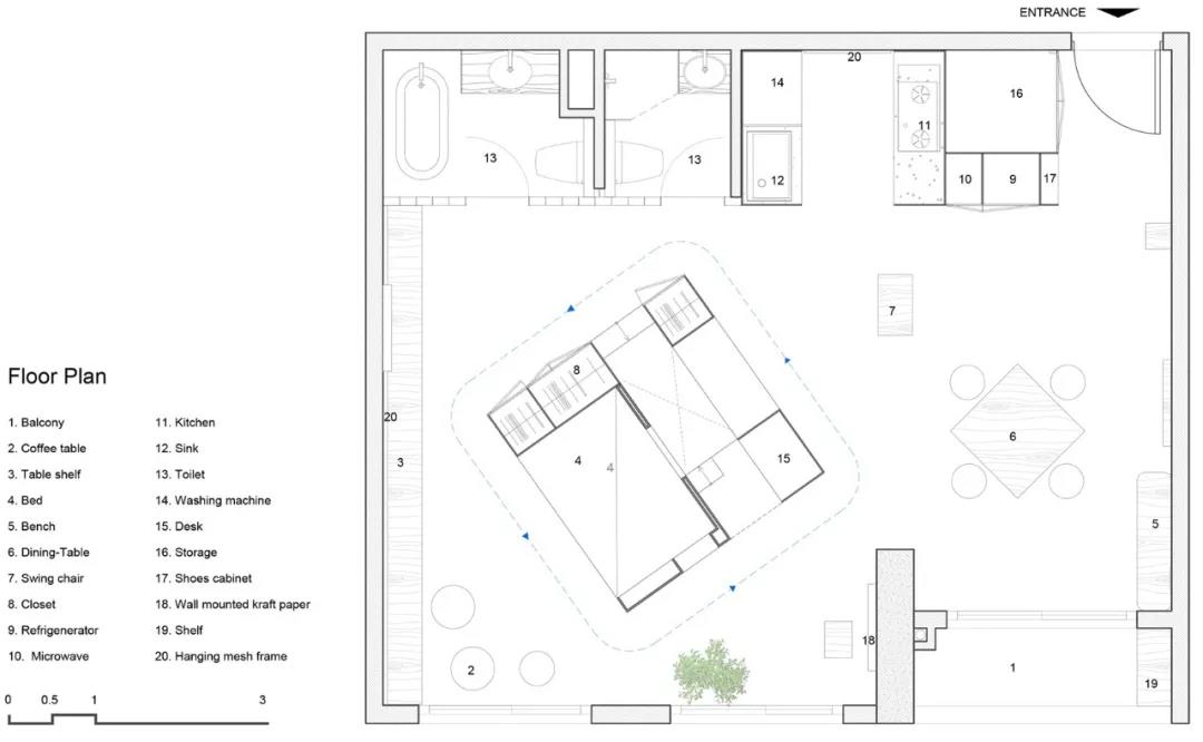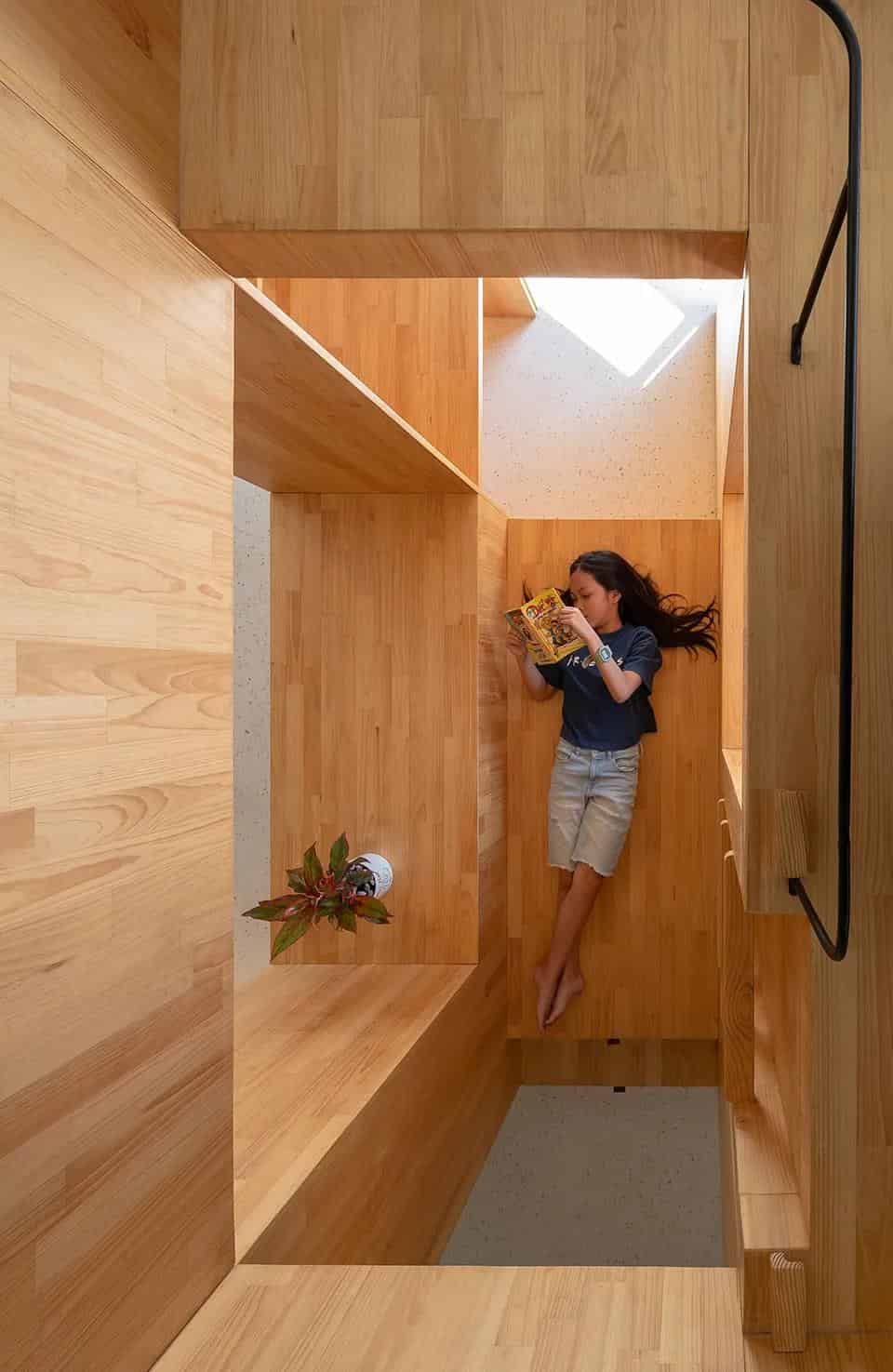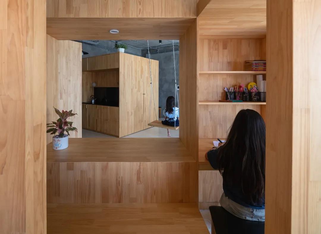 設計師在空間的中央搭建了一個木制的功能巨大的方盒,主人們可以在里面休息,工作學習室內設計。方盒並沒有方正的安置,而是旋轉了45度,讓空間變得通透。