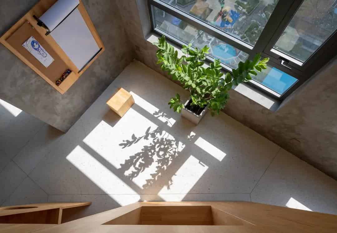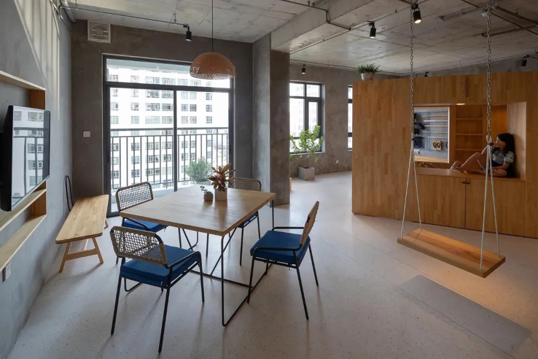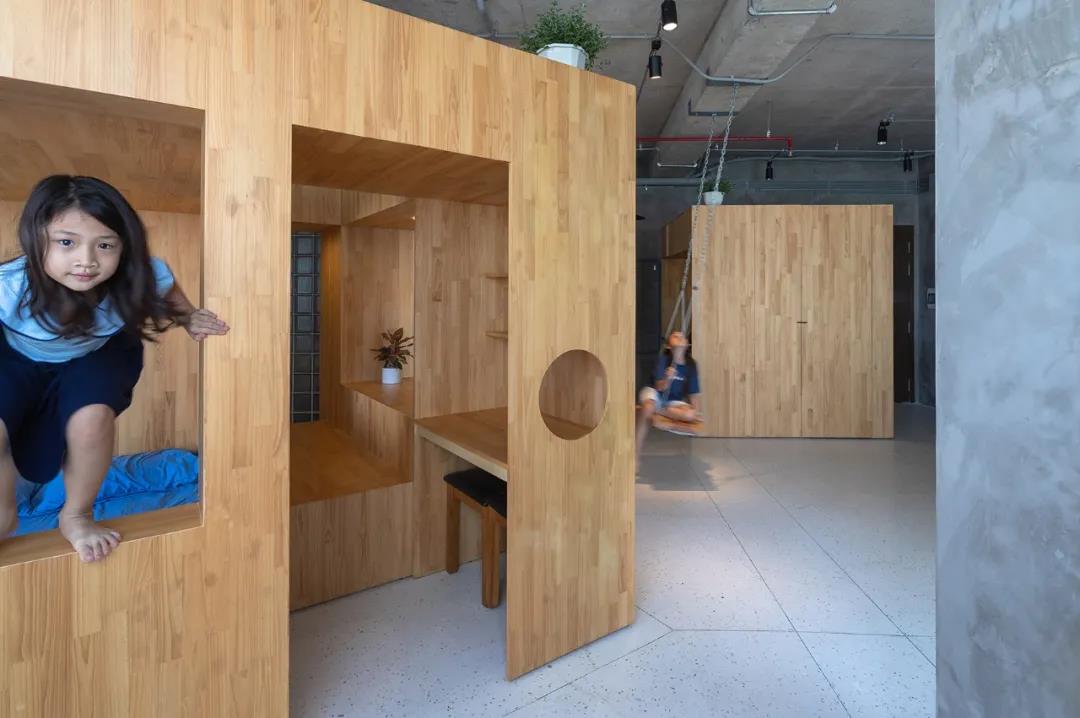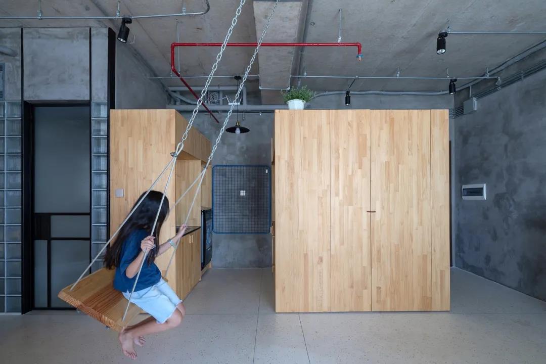 這是一個充滿童趣的屋子室內設計,開放的空間,孩子們可以在這里蕩秋千、攀爬、學習、休息。裸露的水泥墻和原木的搭配,樸實而又溫馨。